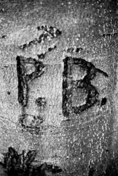 Initials have been gouged into a tree trunk.