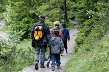 A family hike in the woods.