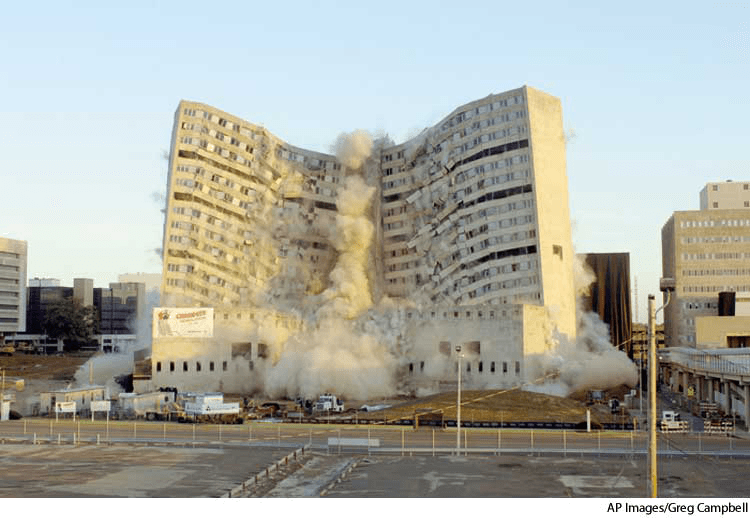 - The inward collapse of a building that is being demolished in a controlled fashion by the weakening and breaking of structural members by explosives.内爆拆除:用爆炸的方法削弱或弄断结构支架,从而按控制好的方式拆除的房子向内崩塌