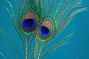 Peacock feathers against an aqua background.