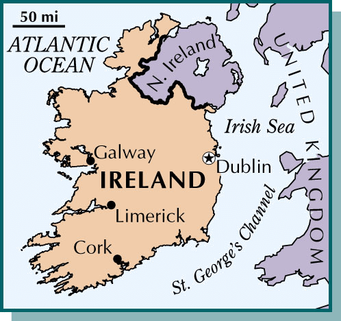 Ireland 1 AHD[īrʹlənd] D.J.[ˈaɪələnd]K.K.[ˈaɪrlənd]NONE(无词性) - An island in the northern Atlantic Ocean west of Great Britain. The island was invaded by Celts c. 500b.c. and converted to Christianity by Saint Patrick in the fifth century a.d. It joined Great Britain in 1801 but after the Easter Rebellion (1916) and a civil war (1919-1921) the island was split into the independent Irish Free State (now Ireland) and Northern Ireland, which is still allied with Great Britain. 爱尔兰:大西洋北部一岛,位于大不列颠以西。该岛在公元前 500年时被凯尔特人入侵,于 公元 5世纪时被圣帕特里克皈依基督教。它在1801年加入大不列颠,但在复活节起义(1916年)和内战后(1919-1921年)该岛分裂为独立的爱尔兰自由邦(现在的爱尔兰)和北爱尔兰,后者仍然与大不列颠联合
