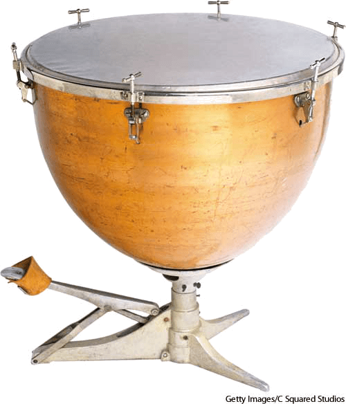定音鼓:一种大的半球形红铜或黄铜鼓,面为羊皮纸,能通过调整拉力调音