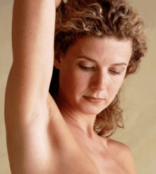 Woman with arm raised revealing armpit.