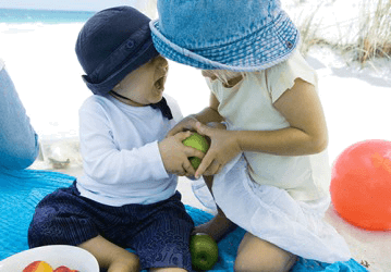 Erica's little sister got mad at her because se tried to get the apple from her hands.