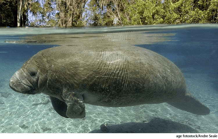 man·a·tee AHD[mănʹə-tē'] D.J.[ˈmænəˌtiː]K.K.[ˈmænəˌti]n.(名词) manateeFlorida manateeTrichechus manatus subsp. latirostris- Any of various herbivorous aquatic mammals of the genusTrichechus, having paddlelike front flippers and a horizontally flattened tail and found in warm coastal waters of Florida, northern South America, West Africa, and the Caribbean. 海牛:一种海牛 属食草性水生哺乳动物,长有蹼状前鳍,居中扁平的尾巴,产于美国佛罗里达州、南美洲北部、西非和加勒比海地区海岸温暖的水域中