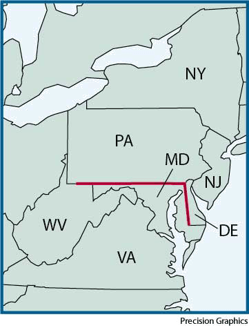 Ma·son-Dix·on Line AHD[māʹsən-dĭkʹsən] D.J.[ˈmeɪsənˈdɪksən]K.K.[ˈmesənˈdɪksən]NONE(无词性) Mason-Dixon LineThe original line extended from the southeast corner of the colony of Pennsylvania 233 miles west and 82 miles south.- The boundary between Pennsylvania and Maryland, regarded as the division between free and slave states before the Civil War. It was established between 1763 and 1767 by the British surveyors Charles Mason (1730-1787) and Jeremiah Dixon (died 1777).梅森-狄克森线:美国宾夕法尼亚州和马里兰州的州 界线,内战期间被认为是自由州与蓄奴州的界线。它于1763年和1767年由英国测量家查理斯·梅森(1730-1787年)和杰里迈·狄克森(死于1777年)共同确定