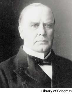 McKinleyWilliam (1843-1901)NONE(无词性)- The 25th President of the United States (1897-1901). His presidency was marked by the Spanish-American War (1898), the annexation of Cuba and the Philippines, an open-door policy with China, and the passage of the Gold Standard Act (1900). He was assassinated by an anarchist in Buffalo, New York.麦金利,威廉:(1843-1901) 美国第25届总统(1897-1901年)。他在职期间的事迹有,发动西班牙-美国战争(1898年),吞并古巴和菲律宾;对华提出门户开放政策;通过金本位法案(1900年)。他在纽约州的布法罗被无政府主义者刺杀