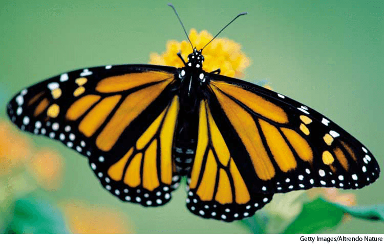 monarch butterflyn.(名词) monarch butterflyfemale monarch butterflyDanaus plexippus- A large American butterfly(Danaus plexippus) having light brown wings with black veins and white-spotted black borders, noted for its long-distance migrations and its brightly striped caterpillars that feed on the milkweed plant. Also called milkweed butterfly 黑脉金斑蝶:一种体形较大的美洲蝴蝶(黑脉金斑蝶 斑蝶属) ,长有浅褐色翅膀,上有黑色翅脉和带白斑的黑色边缘,因其长距离迁徙和捕获以马利筋为食的有鲜艳条纹的毛虫而著名 也作 milkweed butterfly