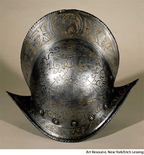 mo·ri·on AHD[môrʹē-ŏn', mōrʹ-] D.J.[ˈmɔːriːˌɒn, ˈməʊr-]K.K.[ˈmɔriˌɑn, ˈmor-]n.(名词) morion116th-century etched Italian morion- A crested metal helmet with a curved peak in front and back, worn by soldiers in the 16th and 17th centuries.高顶盔甲:一种在前侧和后侧带有弯曲的帽舌的金属头盔盔甲,在16世纪和17世纪由士兵配戴