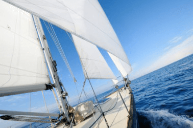 A sailboat propelled by a nautical breeze.