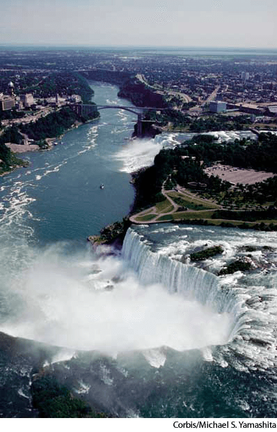Niagara Falls 1NONE(无词性) Niagara Falls1aerial view of the Canadian (foreground) and American (background) Falls- Falls in the Niagara River between the cities of Niagara Falls, New York, and Niagara Falls, Ontario, Canada. The falls are divided by Goat Island into the American Falls, 50.9 m (167 ft) high, and the Canadian, or Horseshoe, Falls, 48.2 m (158 ft) high.尼亚加拉瀑布:尼亚加拉河上的瀑布,位于纽约的尼亚加拉城和加拿大的安大略城之间。瀑布被山羊岛分成50.9米(167英尺)高的美国瀑布和48.2米(158英尺)高的加拿大马蹄瀑布