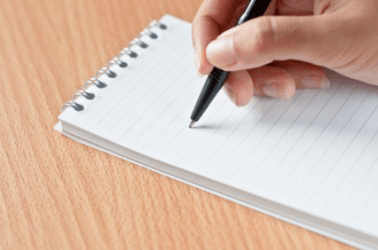 A woman writes in a notebook.