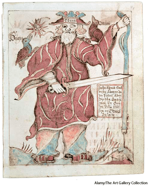O·din AHD[ōʹdĭn] D.J.[ˈəʊdɪn]K.K.[ˈodɪn]n.Mythology(名词)【神话】 Odinfrom a 1760 Icelandic illuminated manuscript by Ólafur Brynjúlfsson- The Norse god of wisdom, war, art, culture, and the dead and the supreme deity and creator of the cosmos and human beings.奥丁:挪威的智慧、战争、艺术、文化和死亡之神,被认为是最高级的神、宇宙和人类的创造者