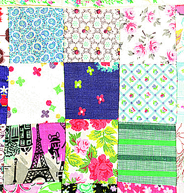 1. Needlework consisting of varicolored patches of material sewn together, as in a quilt.拼缝物:缝合起来的形形色色的缝织物,如在被子上的