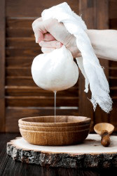The permeable qualities of the cheese cloth allow the liquid to be squeezed from the homemade mozzarella.