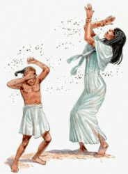 A pestilence of flies surrounding an Egyptian woman and child.