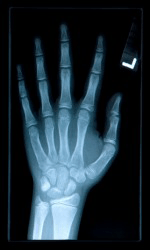The Xray of a hand shows the phalanges of the fingers.