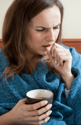 A sick woman drinking hot tea to calm her cough and loosen phlegm.