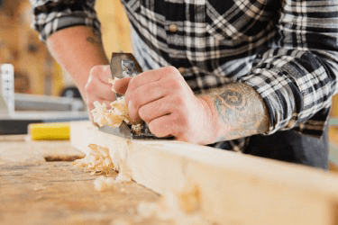 A woodworker planing a piece of wood.