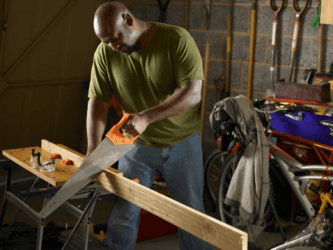 A man cutting a plank of wood with a saw.