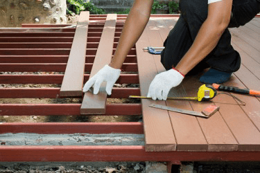 The handyman is planking the back deck of the house.