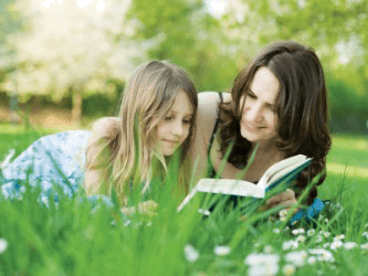 A mother shares the pleasure of reading with her daughter.