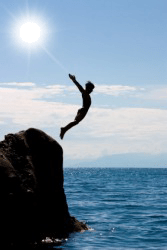 A boy about to plunge into the ocean for a swim.
