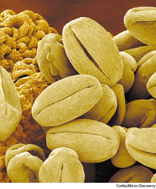 pol·len AHD[pŏlʹən] D.J.[ˈpɒlən]K.K.[ˈpɑlən]n.(名词) pollentop: photomicrograph of ragweed pollenbottom: photomicrograph of cherry pollen pollen- The fine, powderlike material consisting of pollen grains that is produced by the anthers of seed plants.花粉:由种子植物的花药所产生的含有花粉粒的粉粒状的细致物质