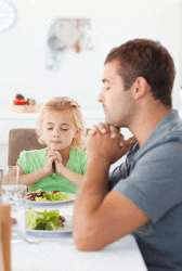 A father and daughter pray before eating their meal.
