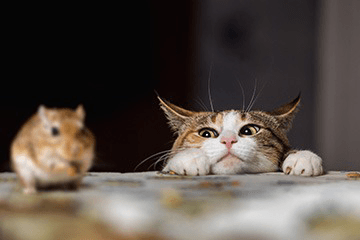 Willie the gerbil obliviously snacked on seeds as Tabitha the cat tried not to act on her natural instincts of predation.
