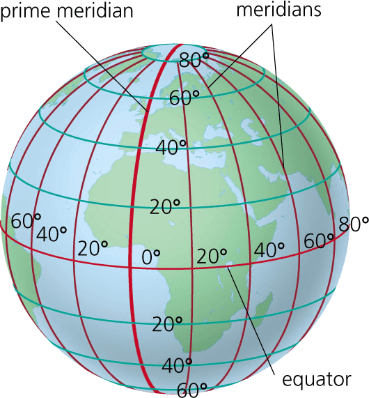 The zero meridian (0°), used as a reference line from which longitude east and west is measured. It passes through Greenwich, England.