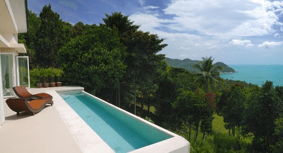 A secluded pool balcony overlooking the ocean offers gorgeous views and privacy.