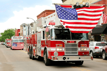 A procession of fire trucks in a small town parade.
