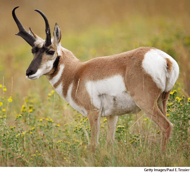 prong·horn AHD[prôngʹhôrn', prŏngʹ-] D.J.[ˈprɔːŋˌhɔːn, ˈprɒŋ-]K.K.[ˈprɔŋˌhɔrn, ˈprɑŋ-]n.(名词)【复数】 pronghorn 或 prong.horns  pronghornAntilocapra americana- A small ruminant mammal(Antilocapra americana) resembling an antelope and having small forked horns, found on western North American plains. Also called pronghorn antelope 麋鹿:小的反刍哺乳动物(叉角羚) ,象羚羊,有小而分叉的角,生活在北美洲大平原西部 也作 pronghorn antelope