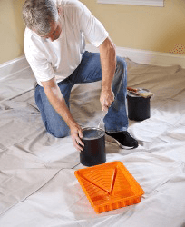 He uses a special tool to pry the lid off of the can of paint.