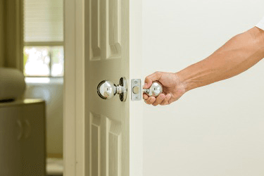 He pulls the door open to enter the room.