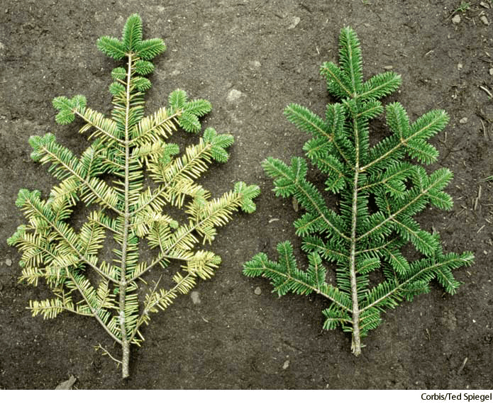 left:a yellowed and dying branch due to the effects of acid rain