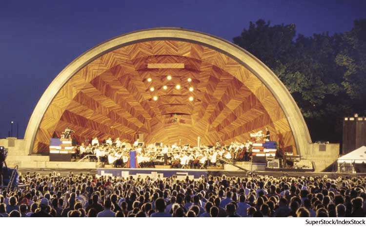 band shell 也作 band·shell AHD[băndʹshĕl'] D.J.[ˈbændˌʃel]K.K.[ˈbændˌʃɛl]n.Music(名词)【音乐】 band shellHatch Shell on the EsplanadeBoston, Massachusetts- A bandstand with a concave, almost hemispheric wall at the rear that serves as a sounding board.户外音乐台:凹形的、后部由作为共振板的近似半球形的墙壁构成的音乐台