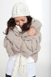 A woman quivers from the cold.