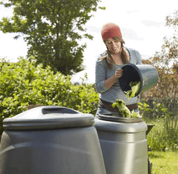 Jade is recycling vegetable scraps by discarding them into the compost bin.