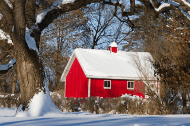 A red barn in the snow.