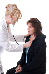 A doctor checks a woman's respiration.