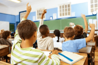 Students raise their hands in response to the teachers question.
