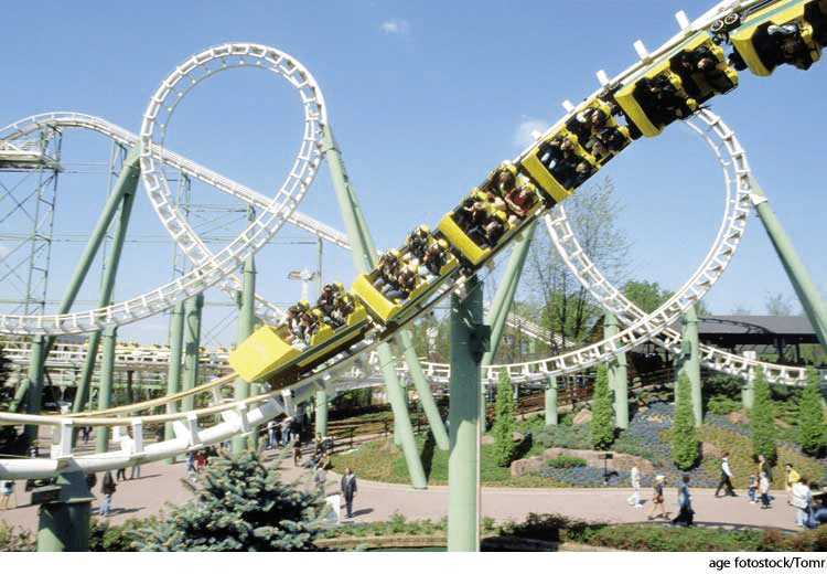 roller coastern.(名词) roller coasterMagic Mountain roller coasterGardaland, Italy- A steep, sharply curving elevated railway with small open passenger cars that is operated at high speeds as a ride, especially in an amusement park.翻滚过山车, 云霄飞车:一种上有敞篷的小型车厢且快速行驶的有急转弯的大坡度高架轨道,尤指游乐园中的乘坐装置