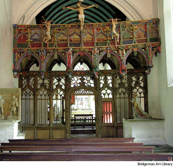 An ornamented altar screen surmounted by a crucifix that separates the choir of a church from the nave.