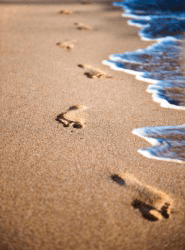 Footprints in the sand on a beach.
