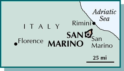 San Ma·ri·no AHD[mə-rēʹnō] D.J.[məˈriːnəʊ]K.K.[məˈrino]NONE(无词性) - A country in the Apennines near the Adriatic Sea. It is surrounded by Italy and is the world's smallest republic. According to tradition, it was founded in the fourth centurya.d. and has succeeded, with a few brief interruptions, in maintaining its independence because of its relative inaccessibility. The city of San Marino is its capital. The country's population is 21,537; the city's, 4,628. 圣马利诺:世界上最小的共和国,位于亚平宁山脉靠近亚得里亚海沿岸,周围被意大利环抱,传统上认为它建于公元 4世纪,并且因为它相对难以接近,而成功地保持了独立,有几次短暂地失去独立。 圣马利诺 城为其首都。全国人口21,537;该城人口4,628