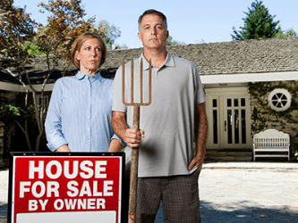 This image of a couple standing in front of a house is an example of satire by mimicking the famous American Gothic painting.