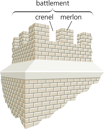 bat·tle·ment AHD[bătʹl-mənt] D.J.[ˈbætlmənt]K.K.[ˈbætļmənt]n.(名词) Precision Graphics- A parapet built on top of a wall, with indentations for decoration or defense. Also called embattlement 城垛:建在墙顶上的护栏,凹处具装饰或防御功能 也作 embattlement