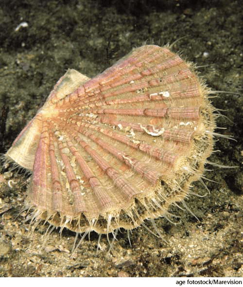 3. A shell of this mollusk, or a dish in a similar shape, used for baking and serving seafood.扇贝壳:这种扇贝的贝壳,或状如扇贝壳的碟子,用于煮和盛放海鲜